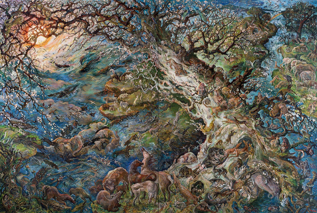 遠藤さんの絵のモチーフには初期の「楽園」シリーズでは人、「街」シリーズでは建造物などがタイトルどおりに多くでてくるのですが、「大作」になってくると自然界に生きるいろいろな動物や植物、自然の様子がふんだんに取り込まれてきます。