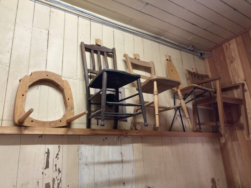 展示室の手前のエントランスの上には、それぞれが異なるデザインの個性的な椅子が何脚も展示されています。