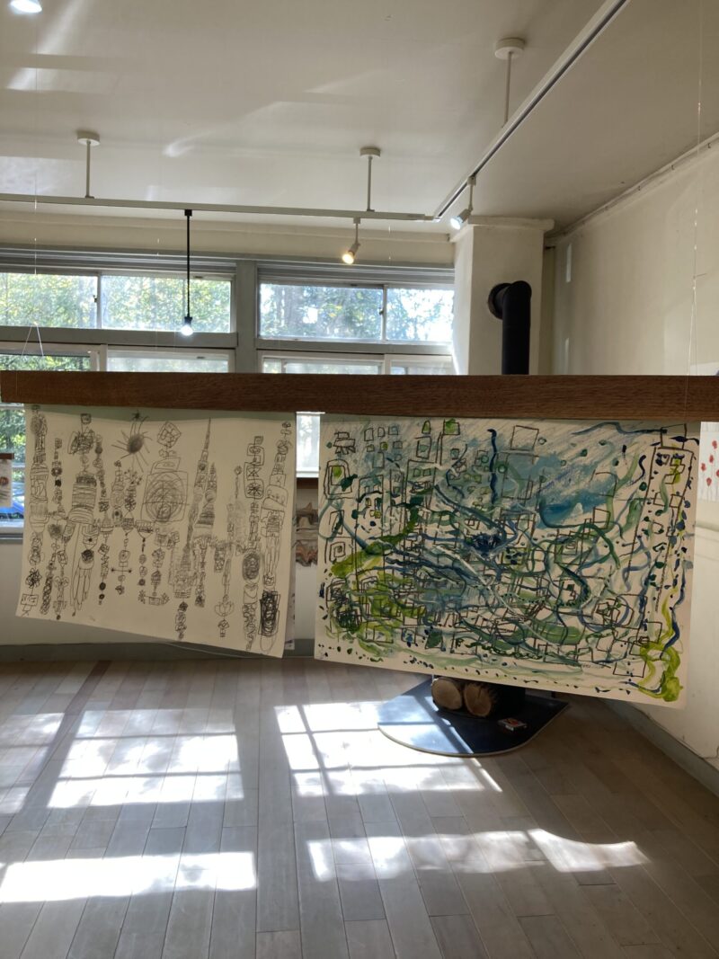 ファーマーズ・ガーデン・マーケットは近隣の市町村からも多くの出店があり、とても賑やかで楽しい不定期開催の朝市。この「北の住まいの設計社」の工場内にあるKsギャラリーで、アートスクールM(N).A.R.Sに通う生徒さんたちの展覧会が2025年10月4日からマーケットに合わせて開催されました。